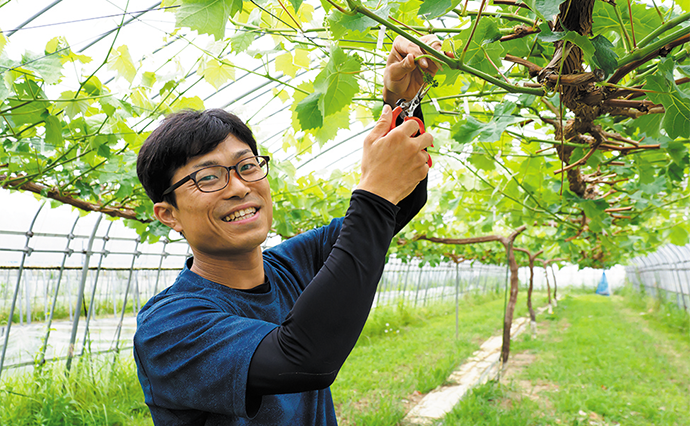 「最高のシャインマスカットを食べていただくために、管理作業を徹底して行います。収穫する房は一本の枝に一つです。養分を集中させて粒が大きく、味のいい実が育つように、ほかの房は小さなうちにすべて摘んでしまいます。水分管理も大切です。1回に少量の水分を1日に何度も与えることで味のいいシャインマスカットになります」
