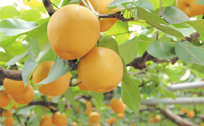 続いては、梨を紹介しよう。「松崎果樹園」は魚粕やなたね粕などの有機肥料を使い、自然にやさしい梨栽培を行っている。同園ではさまざまな種類の梨を栽培しているが、ご紹介するのは「新高」。新高は幸水や豊水に次ぎ、生産量の多いおなじみの品種。果汁たっぷりで濃厚、果肉が少しやわらかな、平均サイズ400g以上と比較的大型の梨だ。ジューシーで香り豊かな新高は2025年10月10日までが申し込み期日となっている。