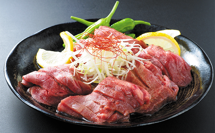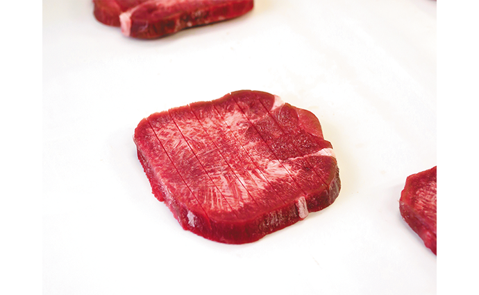 「この牛タンはボリューム感と食べやすさのバランスがちょうどいい7〜8㎜の厚さにスライス。表面に切り込みを入れ、味が染み込みやすく、やわらかく仕上がっています。牛タン本来の旨みを感じていただけるよう、自社配合の塩ダレでどなた様にも好まれる味つけです」
