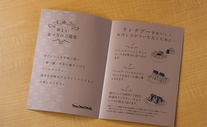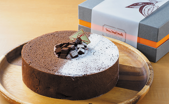 まずはベルギー産チョコレートをふんだんに使った生チョコバーム「ランデブー」を紹介しよう。こちらはバームクーヘンタイプの冷凍のお菓子。中心部に生チョコを詰め、キューブの生チョコをトッピングしたチョコ好きには見逃せないケーキだ。食べ方にも注目したい。