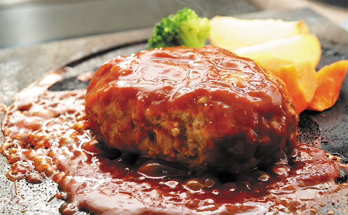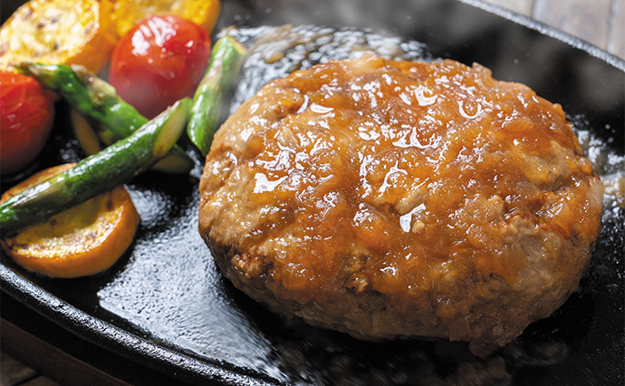 オニオンソースはすりおろしと粗みじん切りの玉ねぎを使用し、玉ねぎの甘みと旨みを最大限に引き出すために工夫を重ねた。大根おろしを添えた和風おろしハンバーグもおすすめ。幅広いアレンジを楽しんでみたい。