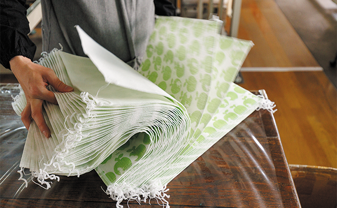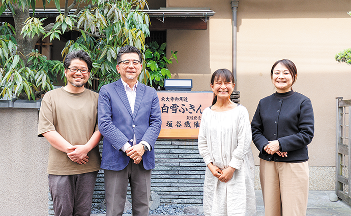 「今でも東大寺の大仏様のお身拭いとして毎年献納しています。蚊帳ふきんは50年以上前、生地のはぎれでつくったことがはじまりです」と教えてくれたのは「白雪」の小笠原晶子さん。蚊帳生地は吸水性に優れ、汚れ落ちがいいことが特長だ。長期にわたり、雪のような白さを保つことから「白雪ふきん」と名づけられた