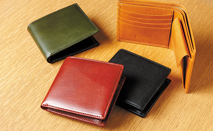 今回紹介する二つ折り財布について「植物性タンニンの鞣しは、手間がかかりますが、手に吸い付くように滑らかに仕上がります。シンプルなデザインは飽きることなく、使い込むほど風合いが増します」と、その魅力を教えてくれた。