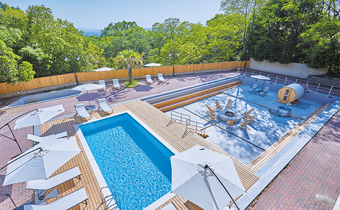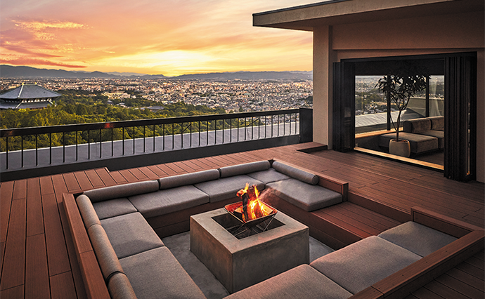 「お部屋の隣にはファイヤーピットと専用の露天風呂を併設しています。どの場所からも奈良盆地の大パノラマを一望できるので、早めにチェックインして美しい景色の変化を感じていただきたいですね。夜は星空の下、ファイヤーピットでマシュマロを焼き、大切な人と楽しい時を過ごせますよ」