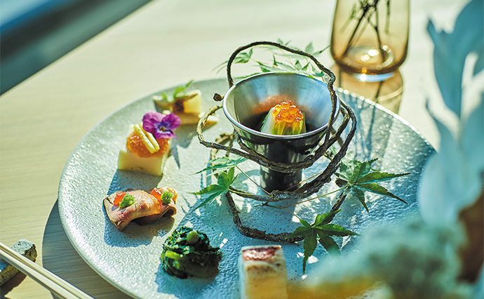 メインダイニングでは、和食の伝統とフレンチの技法や食材を融合させた料理を提供する。夕食は大和野菜や地元のお肉をはじめ、珍しい奈良食材をふんだんに使用。ここでしか味わえない月替わりのメニューは、リピーター客からも好評を得ているそうだ。