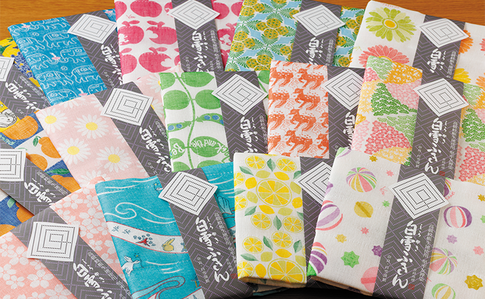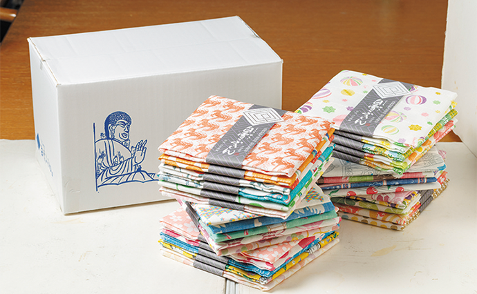 ふきんといえば白地が一般的だった当時、オリジナルデザインを取り入れたのが「友禅ふきん」だ。社長の乾啓二さんは、「絵柄は120種類以上。すべて自社でデザインをし、友禅染めの職人が一つ一つ丁寧に美しい絵柄に染め上げています」と多種多様のふきんを見せてくれた。
