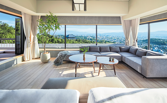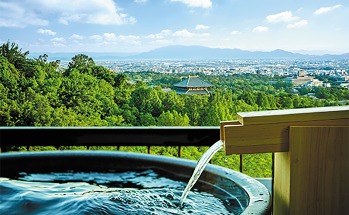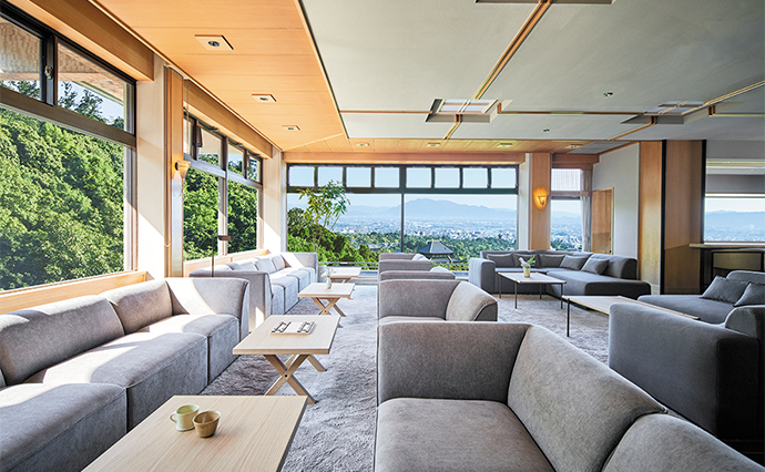 まず訪れたのは、若草山の中腹にそびえる「ANDO HOTEL 奈良若草山」。50年以上続いた老舗旅館を受け継ぎ、2020年に新たに誕生したホテルは、絶景のロケーションが魅力だ。ロビーラウンジに足を運ぶと、東大寺や奈良公園、興福寺の五重塔など、古都奈良の大パノラマがゲストを迎えてくれる。