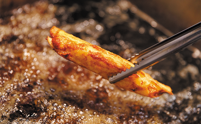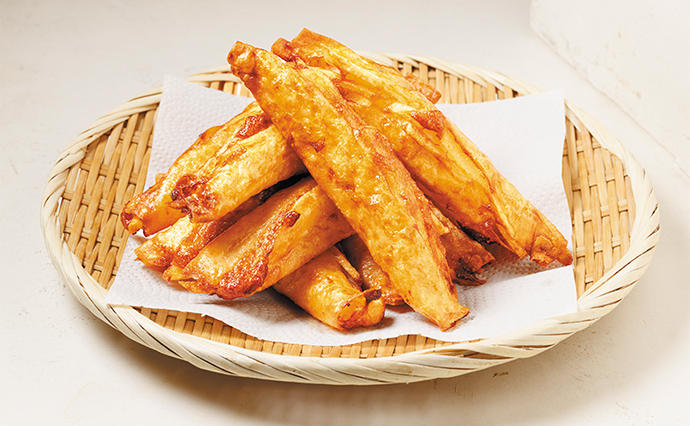 中でも一番人気は、すり身とメークイン、バターを合わせ、サモサシートで巻いて揚げた「バターポテト」だ。「食べ歩きができるようにスティック状にし、店頭で揚げたてを提供しています」と語るのは、専務の魚谷剛生さん。一番おいしい状態で食べてほしいという想いから、返礼品は当日に揚げて発送している。