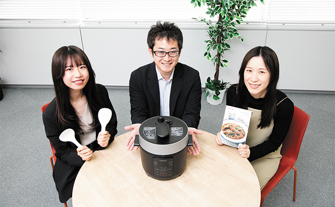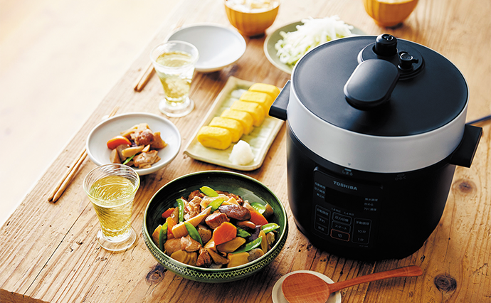「コロナ禍で増えたおうち時間をきっかけに『ほったらかし家電』と呼ばれる自動調理家電が人気です。在宅勤務などで手が離せないというご家庭で2020年頃から需要が高まりました。この電気圧力鍋の特徴は、1.8気圧と1.4気圧の2段階の圧力切り替えが可能なこと。例えばお肉をトロトロにしたいときは1.8気圧、青魚の姿を残したいときは1.4気圧というように、材料に応じて圧力を使い分けができます。2段階なので設定が簡単です」と話してくれたのは「東芝ライフスタイル」の黒﨑秀行さん。