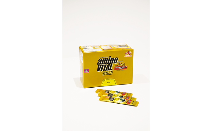 「アミノバイタル®ゴールドは、独自のスポーツ栄養科学のアミノ酸配合で、ハードな運動や試合後のリカバーをサポートします。アミノ酸は筋肉など体を構成するタンパク質のもととなり、アミノバイタル®ゴールドには、ヒトの体内で合成できない9種類の必須アミノ酸が4000㎎配合されています。そのうち、ロイシン高配合BCAAが約2400㎎含まれ、筋肉の材料となる栄養が補給できます。飲みやすいグレープフルーツ味で、接取後、約30分で体内に吸収され、運動後のリカバーを手助けします。運動後飲むことをお勧めしています」。さまざまなスポーツを楽しむ田中さんももちろん愛用中だ。