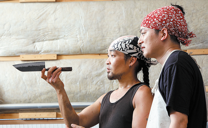 「日本古来の製法で作られた鋼の包丁で、特に純度の高い最上級炭素鋼(白紙一号)を使用して、その材料の能力を活かしきるために、すべての工程を手作業で一貫して行っています。最高の切れ味を、家庭で使いやすい三徳包丁にしました」と話すのは鍛治職人の安倍勇気さん。柄に使用する木材は選定材や建築・家具製造の廃材を再利用しているそうだ。