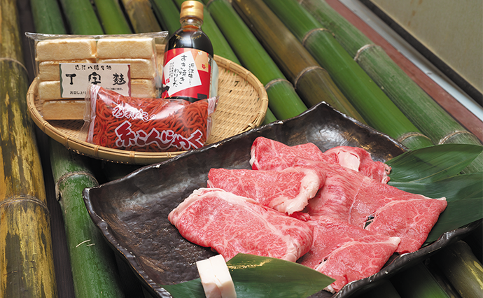 もう一つの返礼品は「近江牛すき焼きセット」。こちらには、セットとして丁字麩と赤こんにゃくが添えられている。いずれも近江八幡市のご当地食材で、いつもと違ったスタイルのすき焼きが楽しめるというわけだ。「この返礼品には近江牛に合うように独自開発したオリジナルのわりしたをつけています」と村上さん。