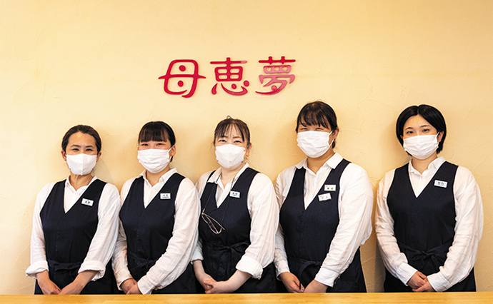 愛媛県では誰もが知っている「母恵夢」。店名にもなっている母恵夢は愛媛県で愛され続けてきた銘菓で、その誕生は戦後まもない1950年。当時は「バター饅頭」として売り出され、バターをたっぷり使ったビスケット生地で黄身餡を包んだ贅沢なお菓子として好評だったという。それから70年以上、ほぼ製法は変わらず、現在もおやつや手土産にと日常に浸透したお菓子として親しまれている。