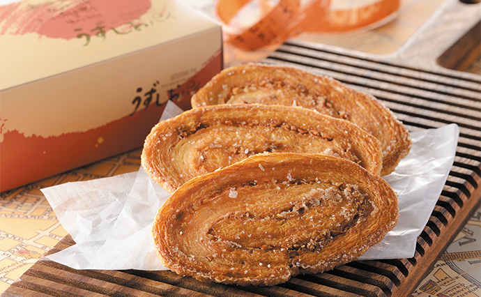そして、来島海峡の渦潮をかたどった焦がしパイの「うずしおパイ」は、ザクザクした食感が特徴。粗きざみのアーモンドと天然バターをたっぷり使い、生地は手作業で作られている。ザクザクの食感がいいと、地元での人気が高い。
