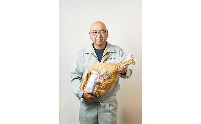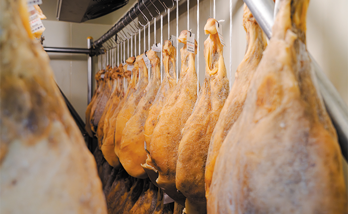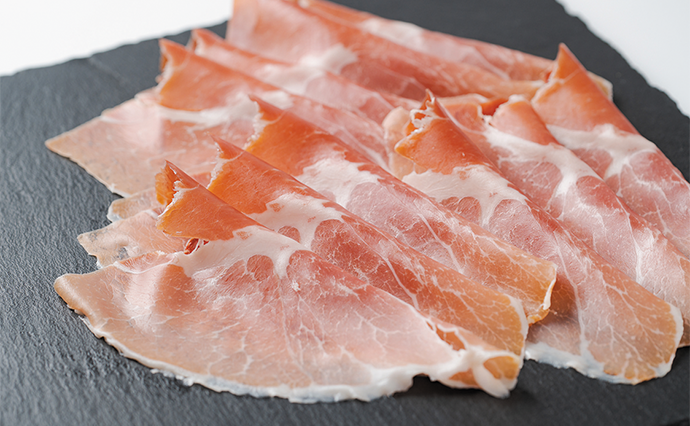 天然塩に漬け込む前は約12㎏ある後ろ足の骨付きが18ヵ月後には約70%の大きさに凝縮される。その生ハム原木をスライスした商品は、芳醇な香りとしっとりした口どけが広がり、かむごとに本来の旨みと、ほのかな甘みが感じられる。