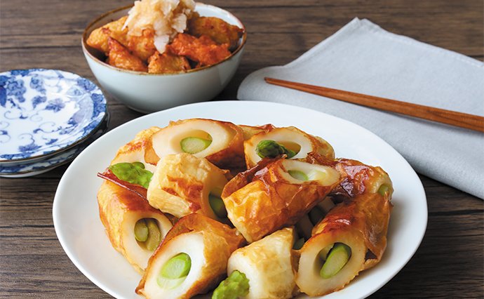 さて、今回は特別に、「2025夏秋号」に掲載したレシピから、熊本県八代市の返礼品「日奈久竹輪天ぷらセット(竹)」を使った料理「日奈久竹輪とアスパラガスの炒め物」と「ちぎり天、ピリ辛天、柚子こしょう天のおろしのせ」をご紹介。